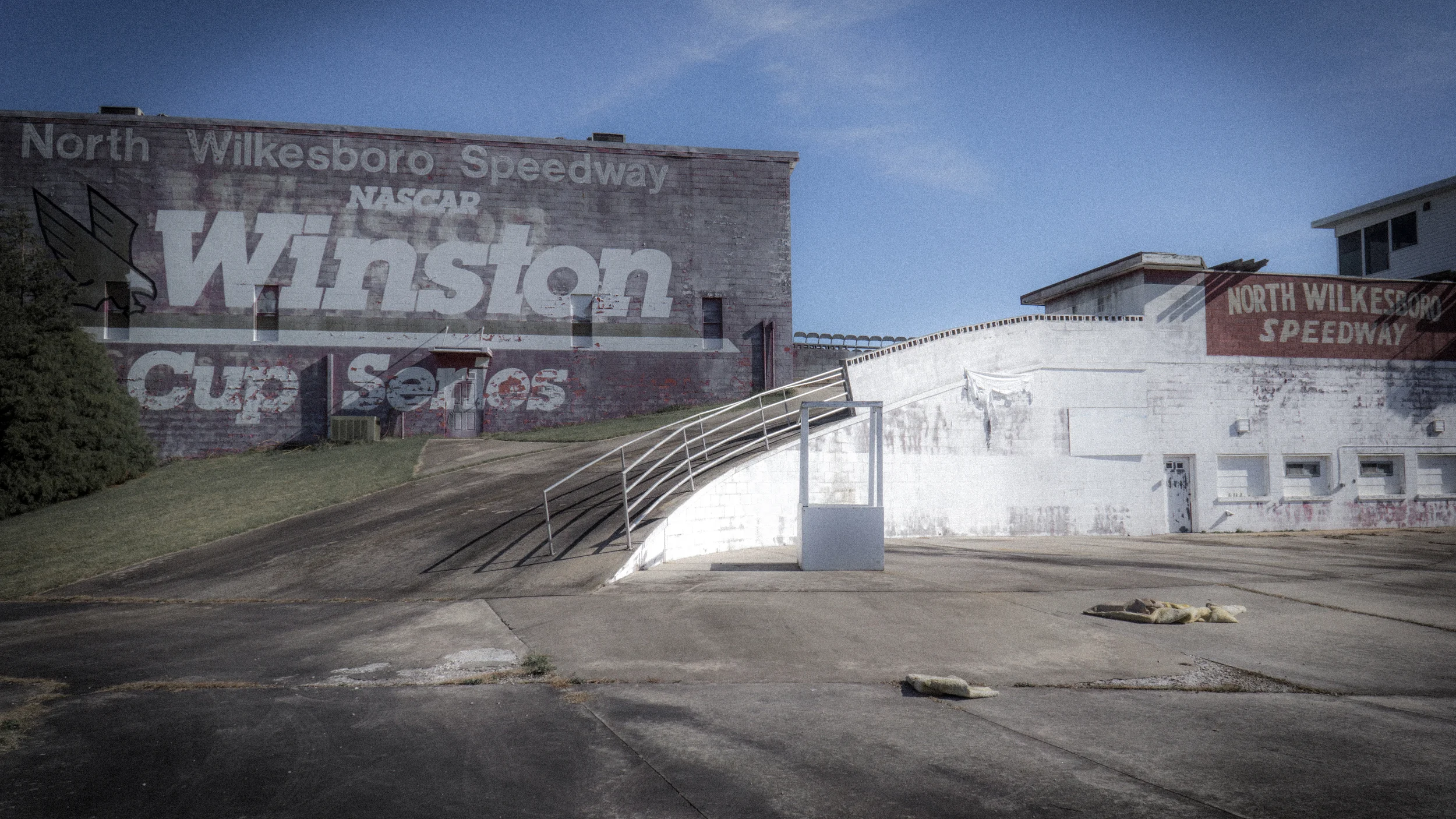 With the final race of the 2015 NASCAR season today, I thought it would be appropriate to take a stroll down memory lane through the old North Wilkesboro Speedway. I have driven past this historic racetrack dozens of times in the past but finally took the time to get off the highway and check it out. It's like a walk through history, accompanied by a very friendly pitbull tour guide who is evidently there to cuddle with the riffraff.