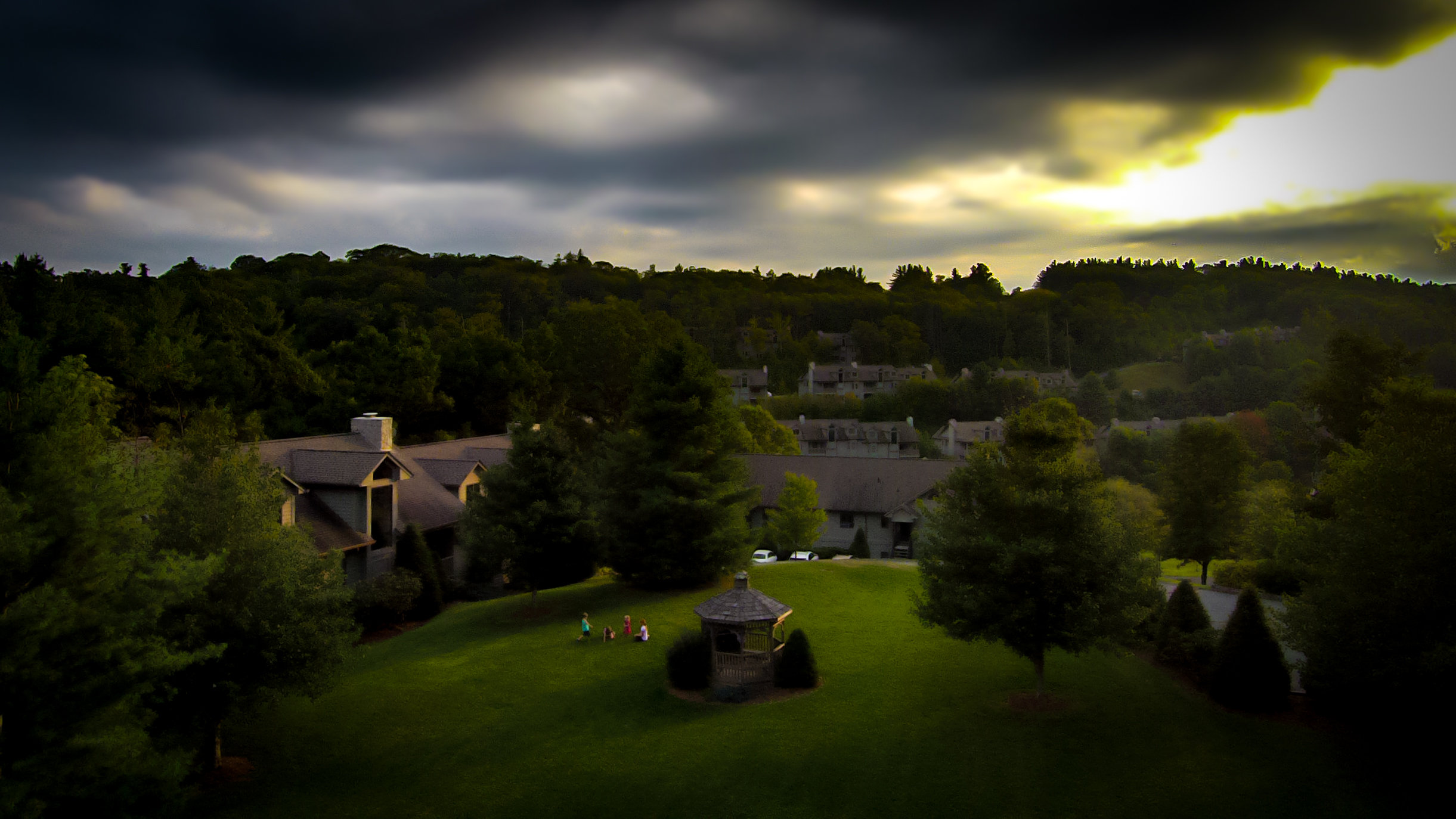 The storm was just rolling in as I put the drone up in the air to capture a few photos of my kids playing in a gazebo field at Chetola Resort. The weather can change on a dime in the North Carolina mountains and they didn't disappoint on this particular day as the black clouds parted just enough to let the sun blaze through. It was already late in the afternoon so the sun cast long, soft shadows across the green field. I think if Thomas Kincade owned a drone, he'd probably be pretty happy with this shot.