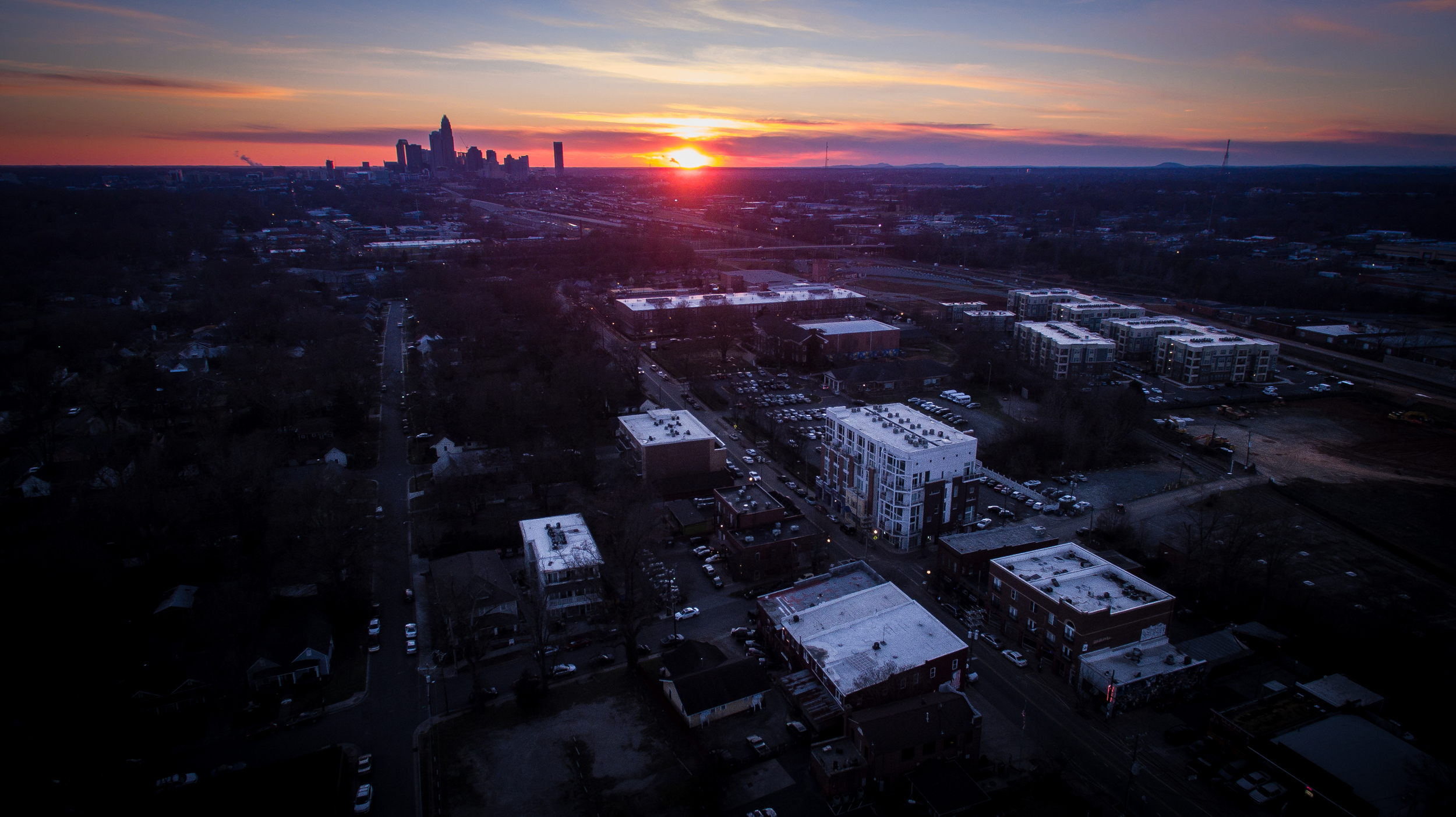 On the horizon, you can see Crowder's Mountain on the right and the two plumes of steam on the left and right of the city (the right one is just next to the sun) are the two Duke Energy nuclear plants that serve the area. This shot also gives you a good view of the new light rail line that is going to connect NoDa to Uptown and south all the way to Pineville. It's going to be great for commercial development but I hope it doesn't destroy the spirit of NoDa... although it inevitably will :-(