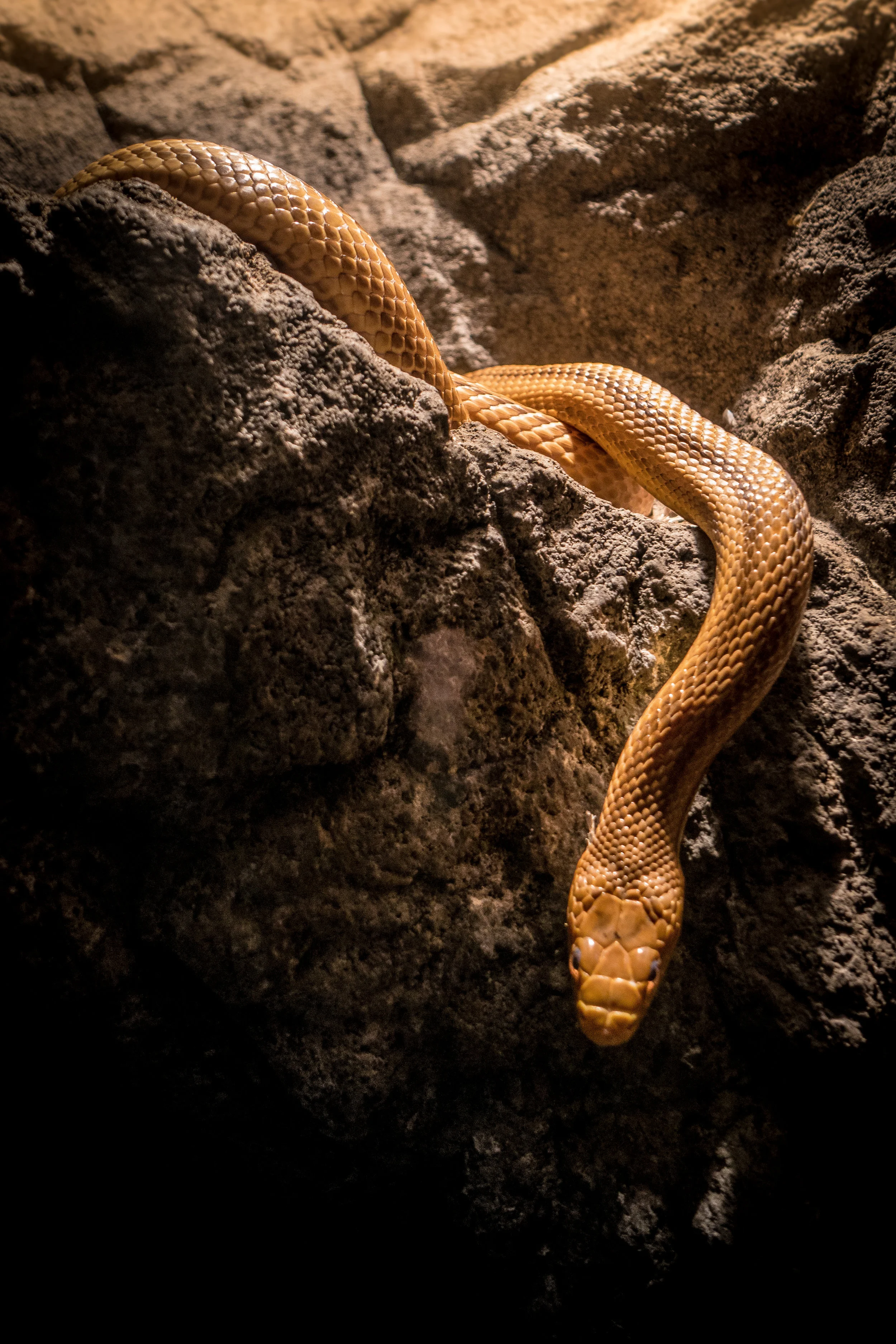 The juvenile black rat snake is born not black but white and brown with a camouflage pattern designed to protect it from predators before it grows up and changes colors. This rat snake lives at the Charlotte Nature Museum in a really nice habitat that looks like it's right out of an Indiana Jones movie.