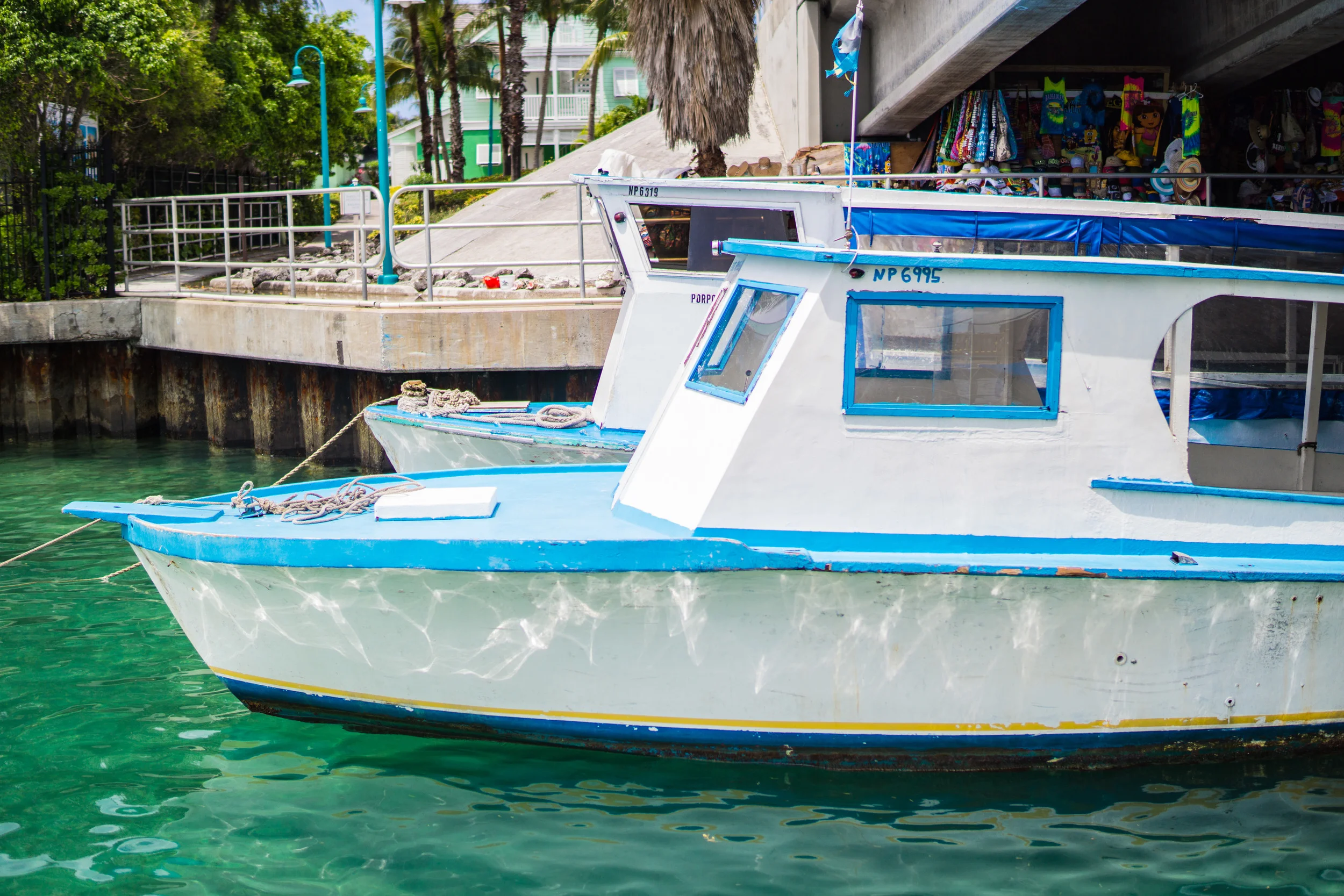 This is another photo in my Paradise Island series. These boats are tied up at the Paradise Island Ferry Terminal, which is really just a little jetty below the bridge where cargo barges filled with plastic patio chairs shuttle people from Paradise Island to downtown Nassau. Despite the lack of frills, the local crew do put on a good show for you as you are under way, including pointing out the original docks that James Bond strutted across in Thunderball. According to the crew, Sean Connery still lives in the Bahamas to this day. This bit of trivia is quickly followed with, "Don't forget to tip your crew members on the way off the boat!"