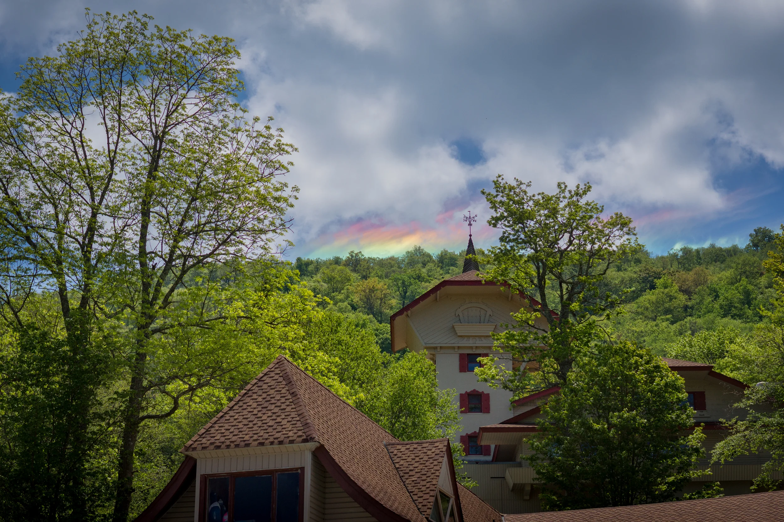 I'm not sure what you call this sort of rainbow but it was really cool to see. This building in the foreground is one of the villages at Ski Beech Resort. We had just taken the chairlift down from 5506 Skybar, the pub next door to the original Wizard of Oz theme park. It seemed fitting to turn back and see a broad rainbow blanketing the top of the mountain over Oz when we returned to the ski village.