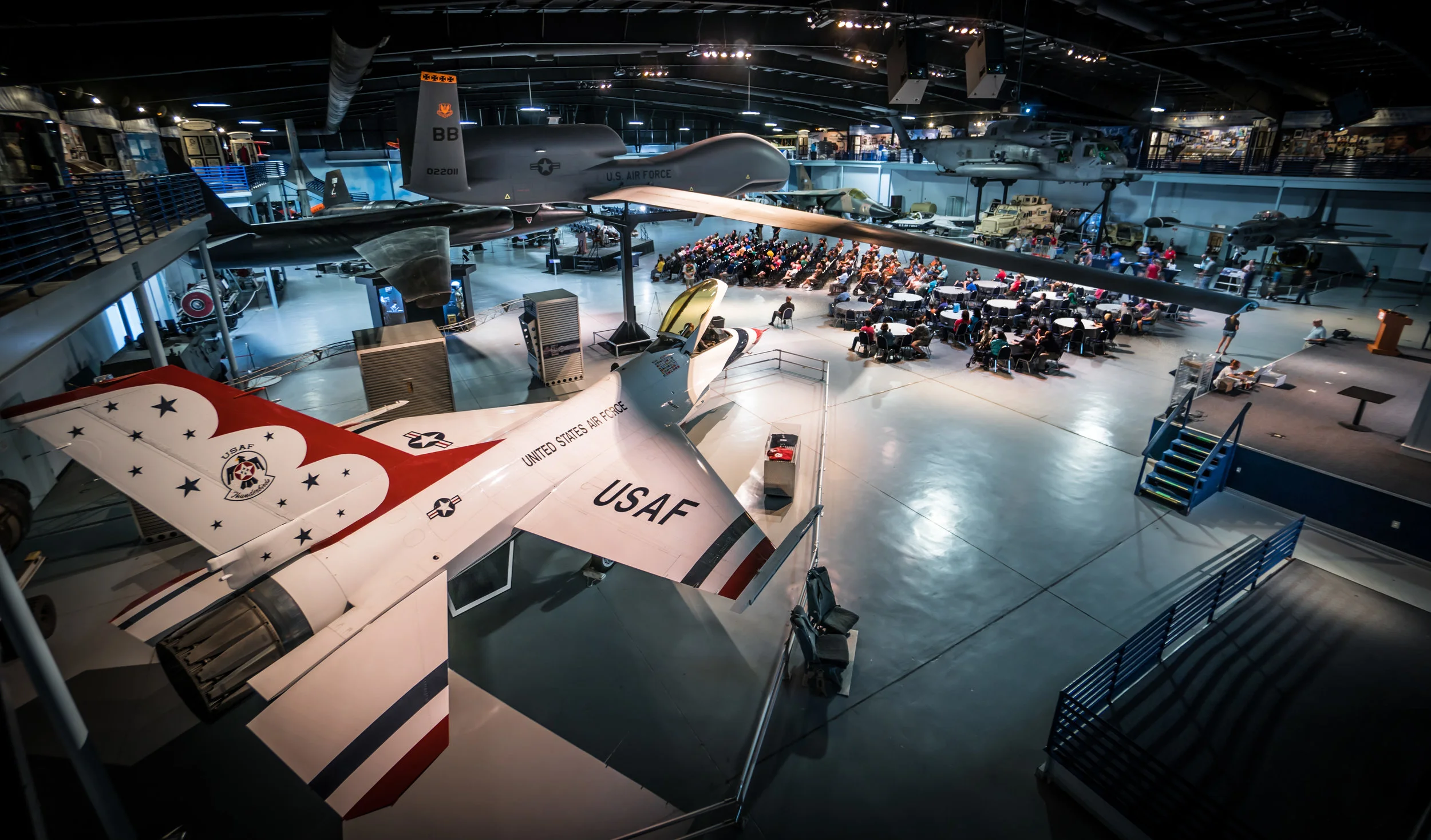 This is one of the best public decommissioned aircraft hangars in the world. Take a look around and you'll see a Thunderbird F-16, MH-53M "Super Jolly" Pave Low, F-111 Aardvark, RQ-4 Global Hawk, U-2 reconnaissance plane, and the pièce de résistance, an SR-71 Blackbird. Not just "any" SR-71 mind you, THE SR-71 that set the world speed record of 2,193 miles per hour! In 1976. And the record still stands. It even flew from New York to London in under 2 hours. Take that, Concorde! See all of the people in the hangar? They're listening to the pilots from those eventful flights sharing their war stories, beneath the nose of their aircraft.