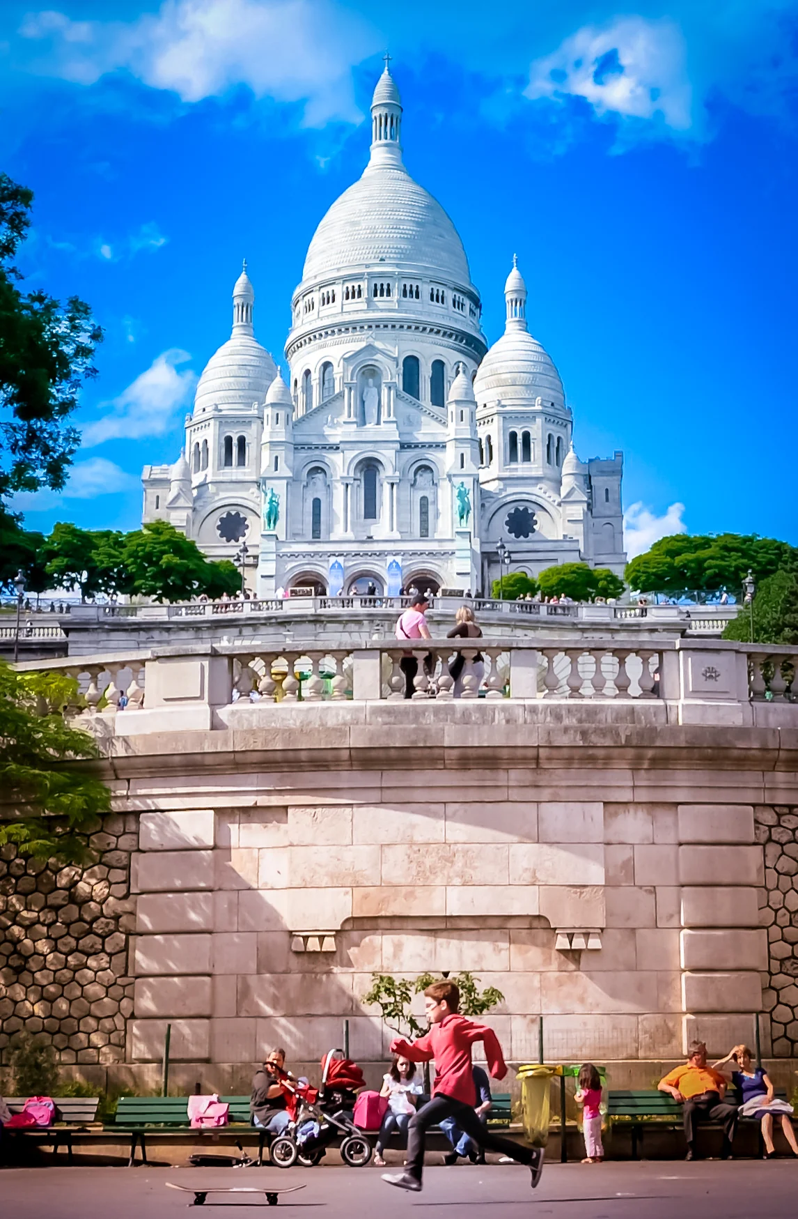 As far as improvised skateparks go, the basilica of Sacré-Cœur in Paris' Montmarte neighborhood might be one of the most scenic. Sure, the basilica is amazing but look at the form of that little skater, just hanging in the air, ready to attack that skate deck!