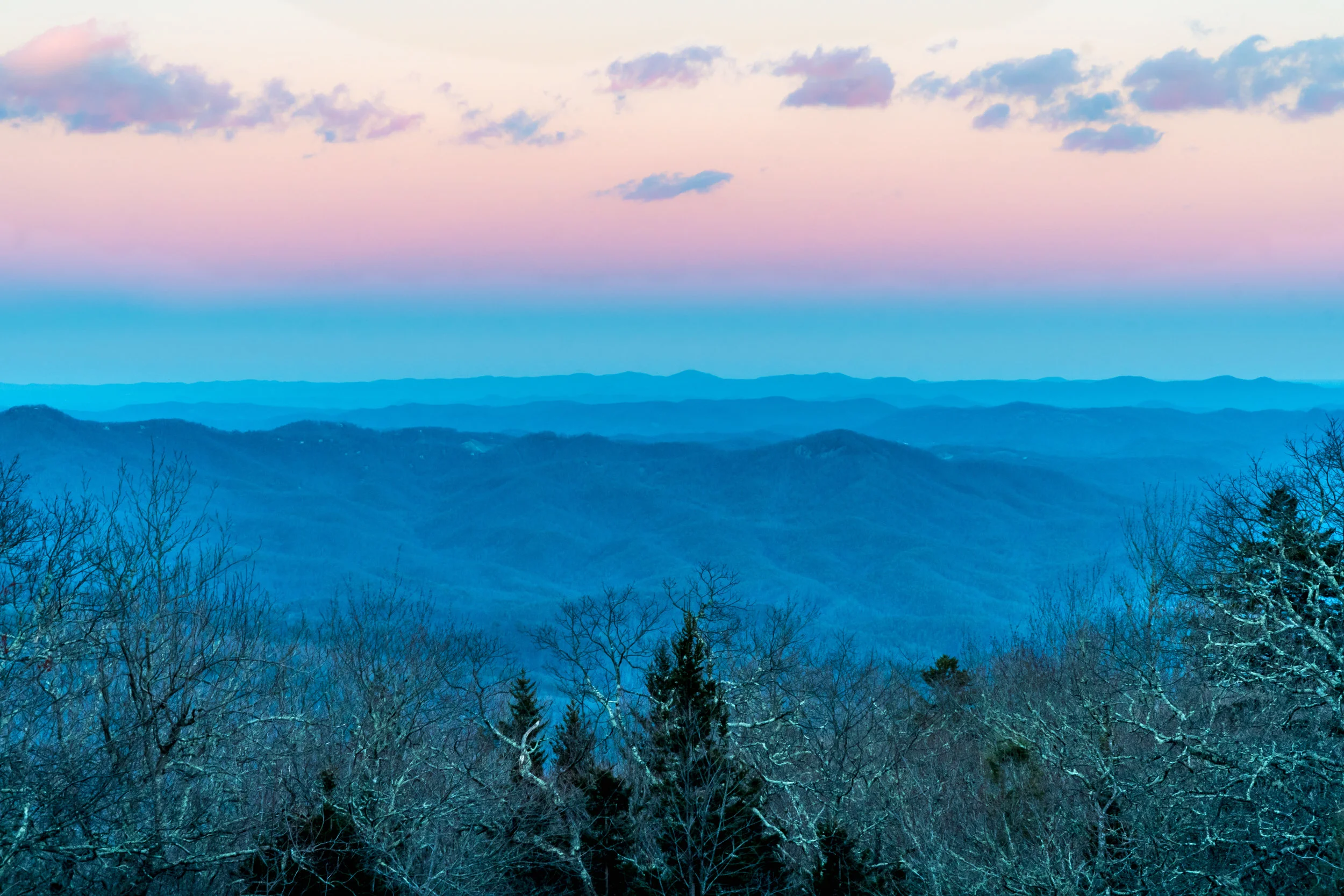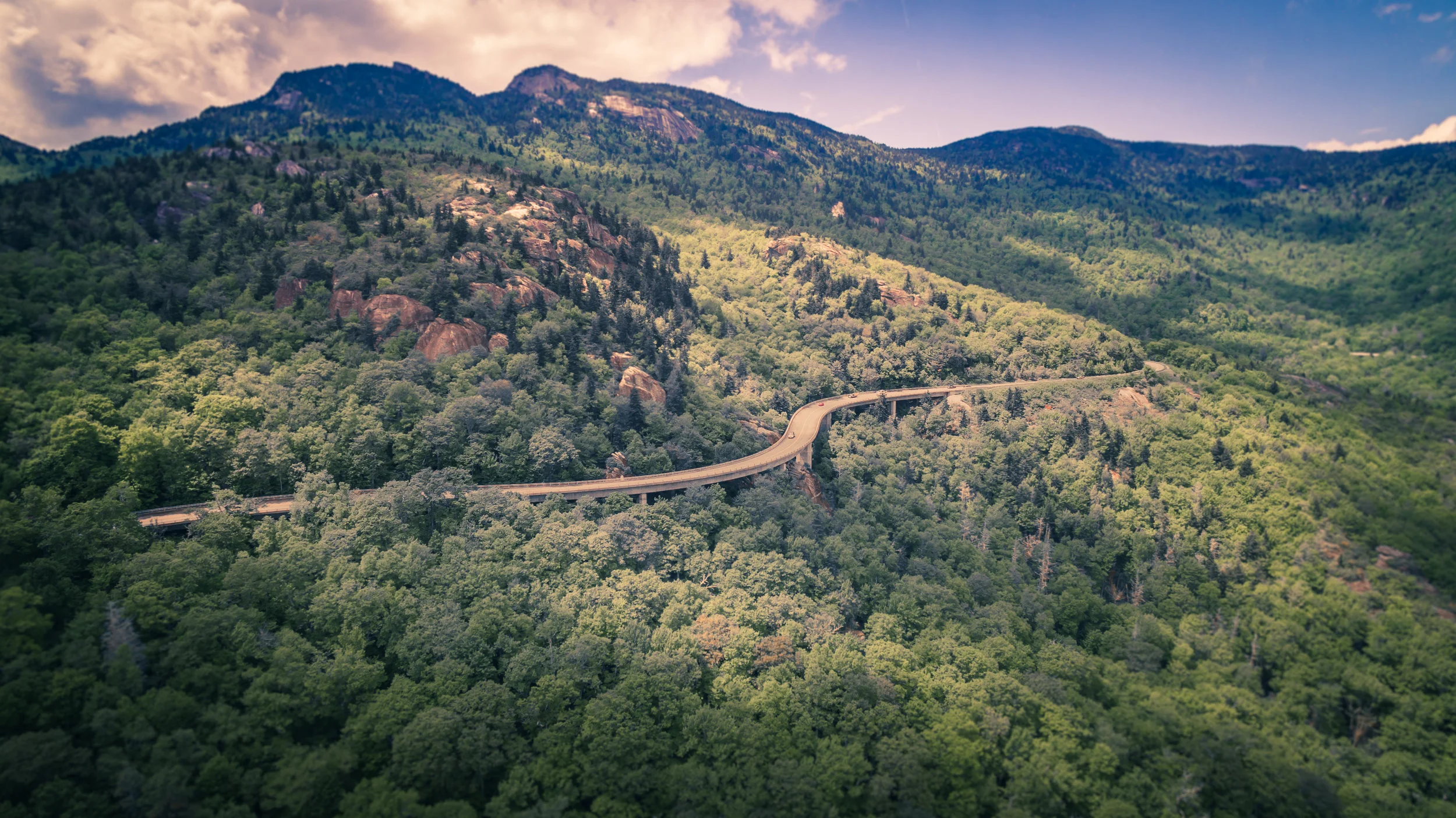 The famous Linn Cove Viaduct wraps around Grandfather Mountain. It was the last stretch of the Blue Ridge Parkway to be completed in the 1980s and was an engineering marvel of its time. If you look closely at the ridge of Grandfather Mountain, you can see the suspension bridge that connects two of the peaks.