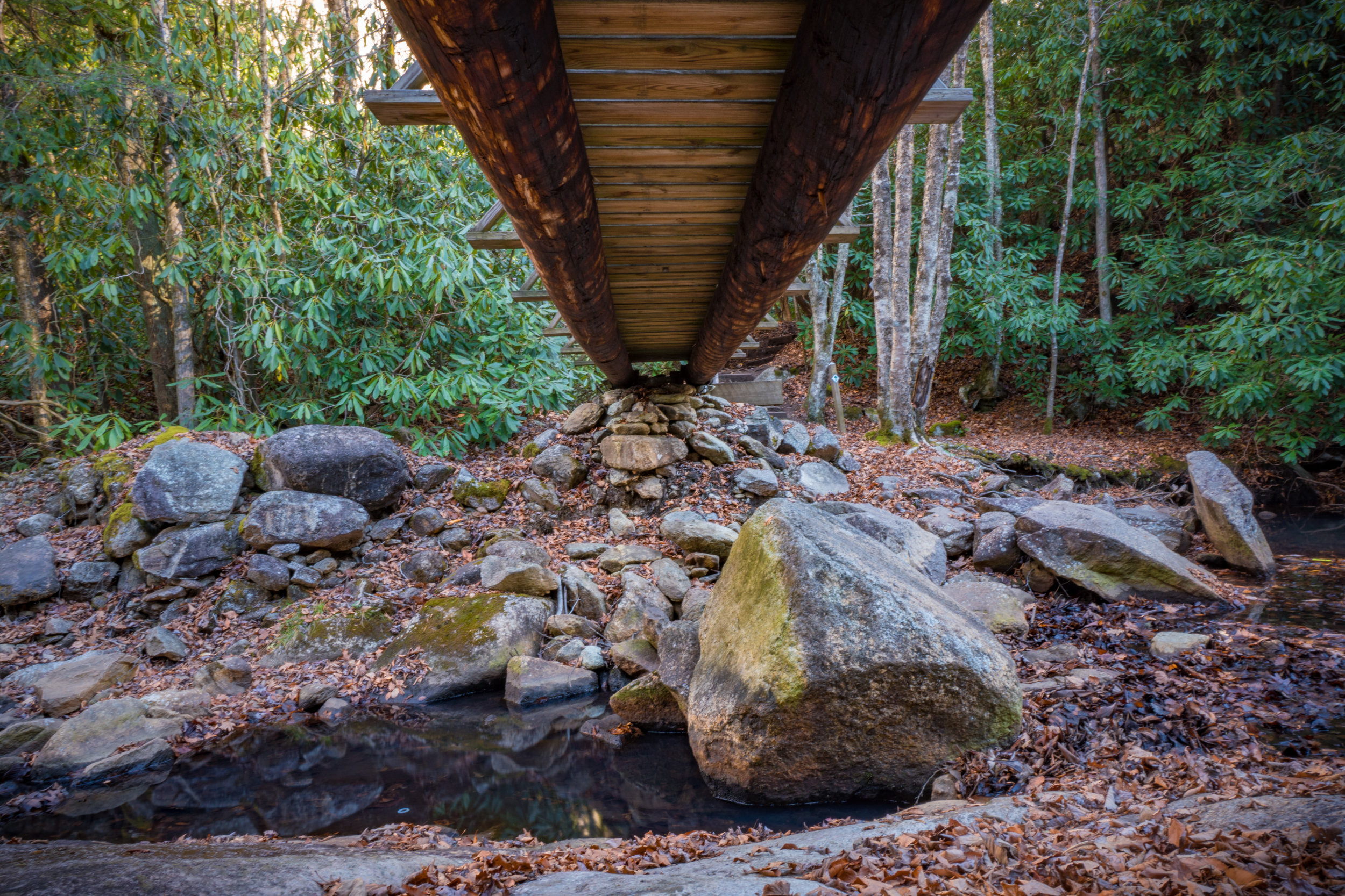 You know you've arrived at the waterfall when you see this hand-hewn log bridge while hiking Falls Creek Loop. At just around one mile, It's a great hike for the entire family.