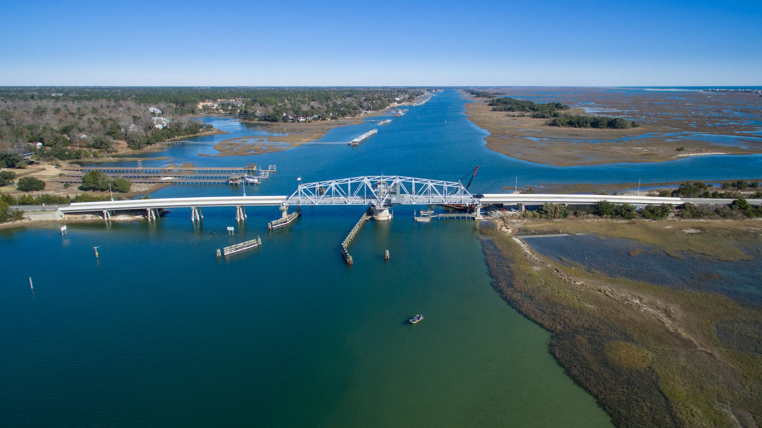 Figure Eight Island, off the coast of Wilmington, is only accessible by boat or this private swingbridge. This limited public access makes Figure Eight Island a private, secure retreat for those who choose to live or vacation there.