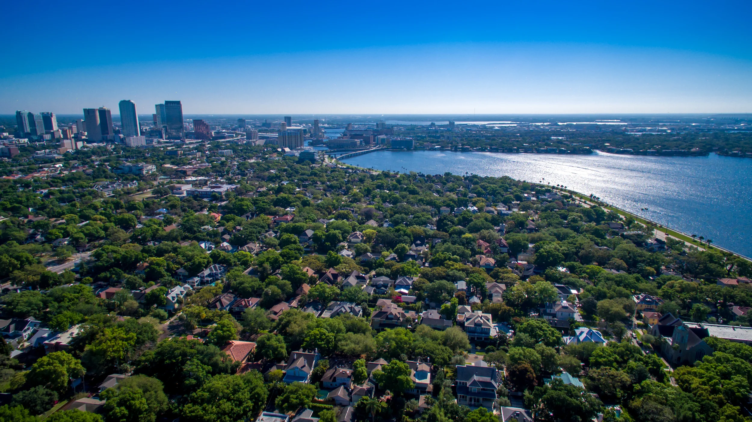 Bayshore Drive — seen here along the water — is a beautiful waterfront road. With the bay on one side and grand, historic homes on the other, it's a really nice place to be. The city in the distance is downtown Tampa.