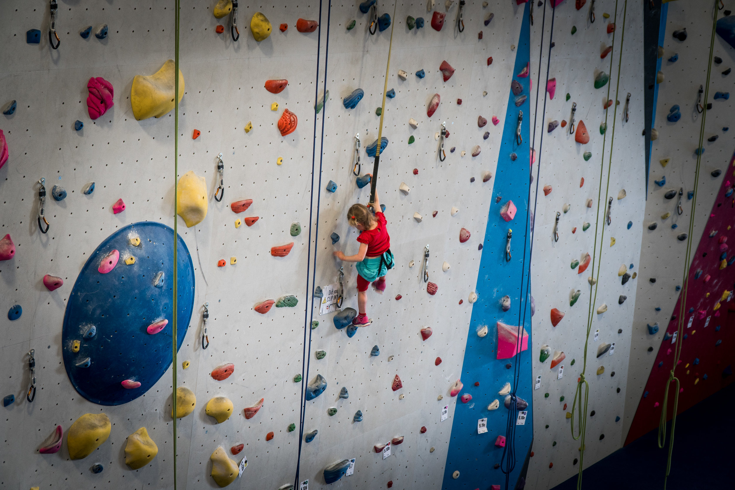Four year-old Annika climbs at Inner Peaks. This was her first visit to a climbing gym and she clicked in to her harness and took off, straight for the top. Experienced climbers commented that she skipped the painstaking process of planning a path and just did it. Girl Power!