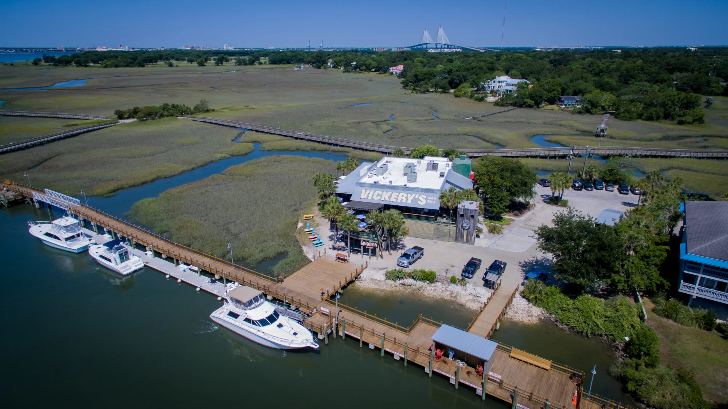 Vickery's is a great waterfront bar and restaurant on Shem Creek in Mount Pleasant. Every trip we take to Charleston always starts with lunch at either Vickery's or Poe's Tavern on Sullivan's Island. If you go in the early afternoon, you are almost guaranteed to see a few dolphins playing along the creek. The dock has been newly renovated and now connects in a loop with the boardwalk over the marsh, which makes for a fun walk after lunch.
