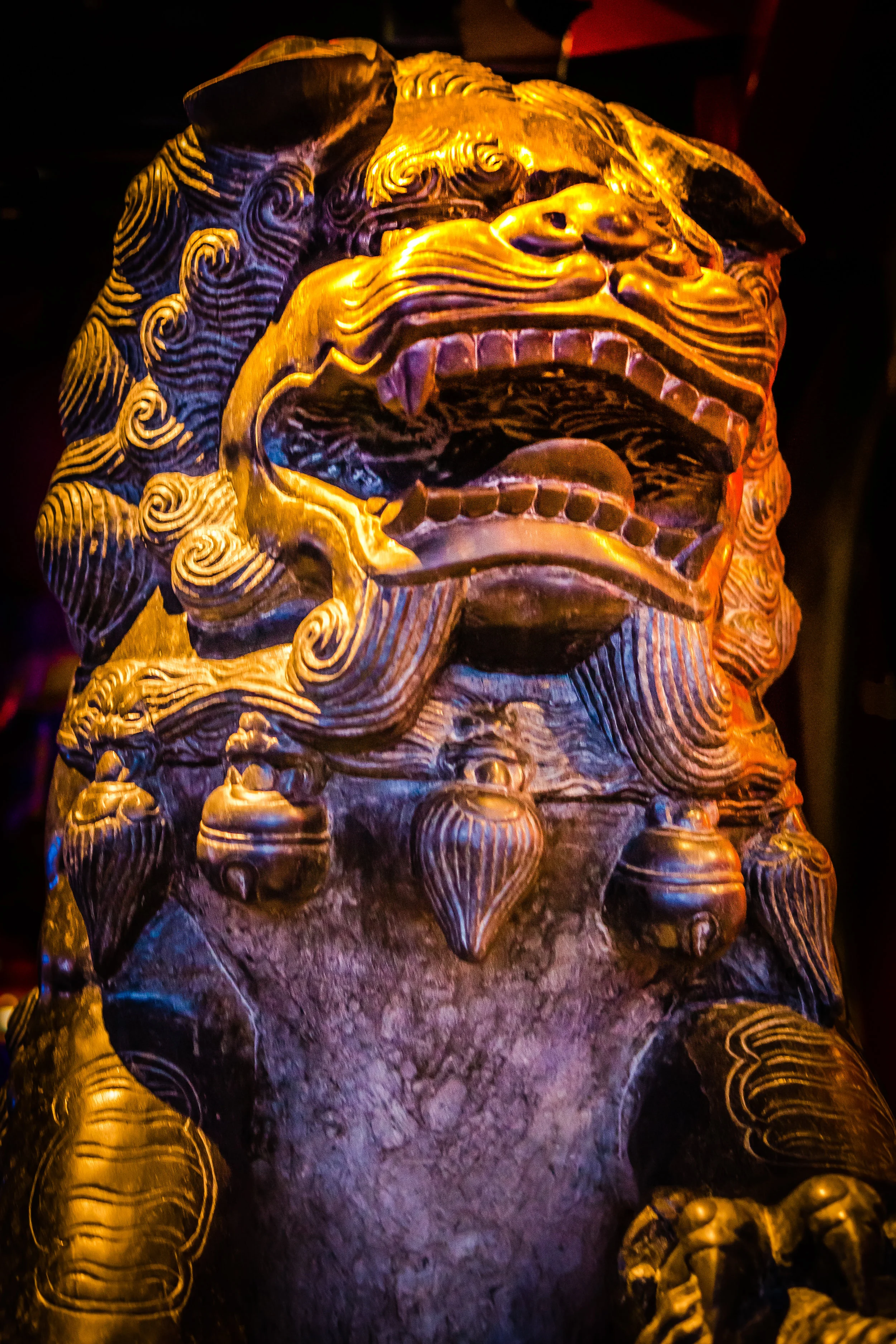 Chinese guardian lions — also known as "Foo Dogs" — adorn entrances to many buildings in China. They are said to have mystic protective powers. Originally, they were installed to protect imperial palaces and memorials but today, they are used just about everywhere... in this case, it is protecting a karaoke bar on the Carnival Ecstasy cruise ship.