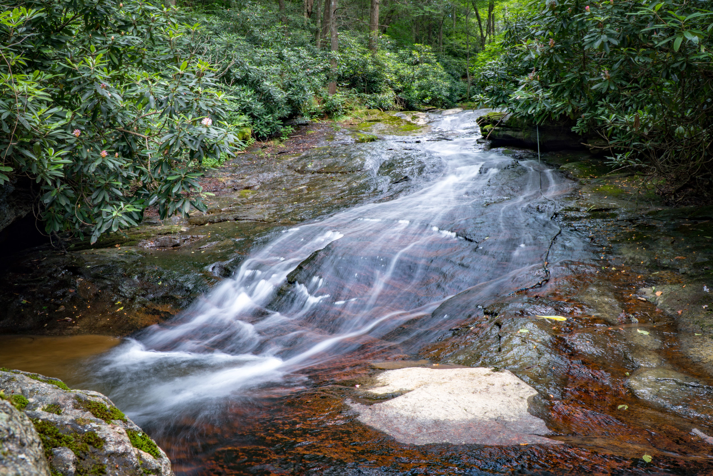 We took a new hiking path on Beech Mountain last week and ended up on a very muddy, somewhat difficult path that ran alongside a creek that was pretty much a continuous waterfall for hundreds of yards (probably more but we had to turn around with no end in sight). We're going to have to push further next time to see if we can find the end of it. It probably feeds into the Elk River at some point way down the mountain.